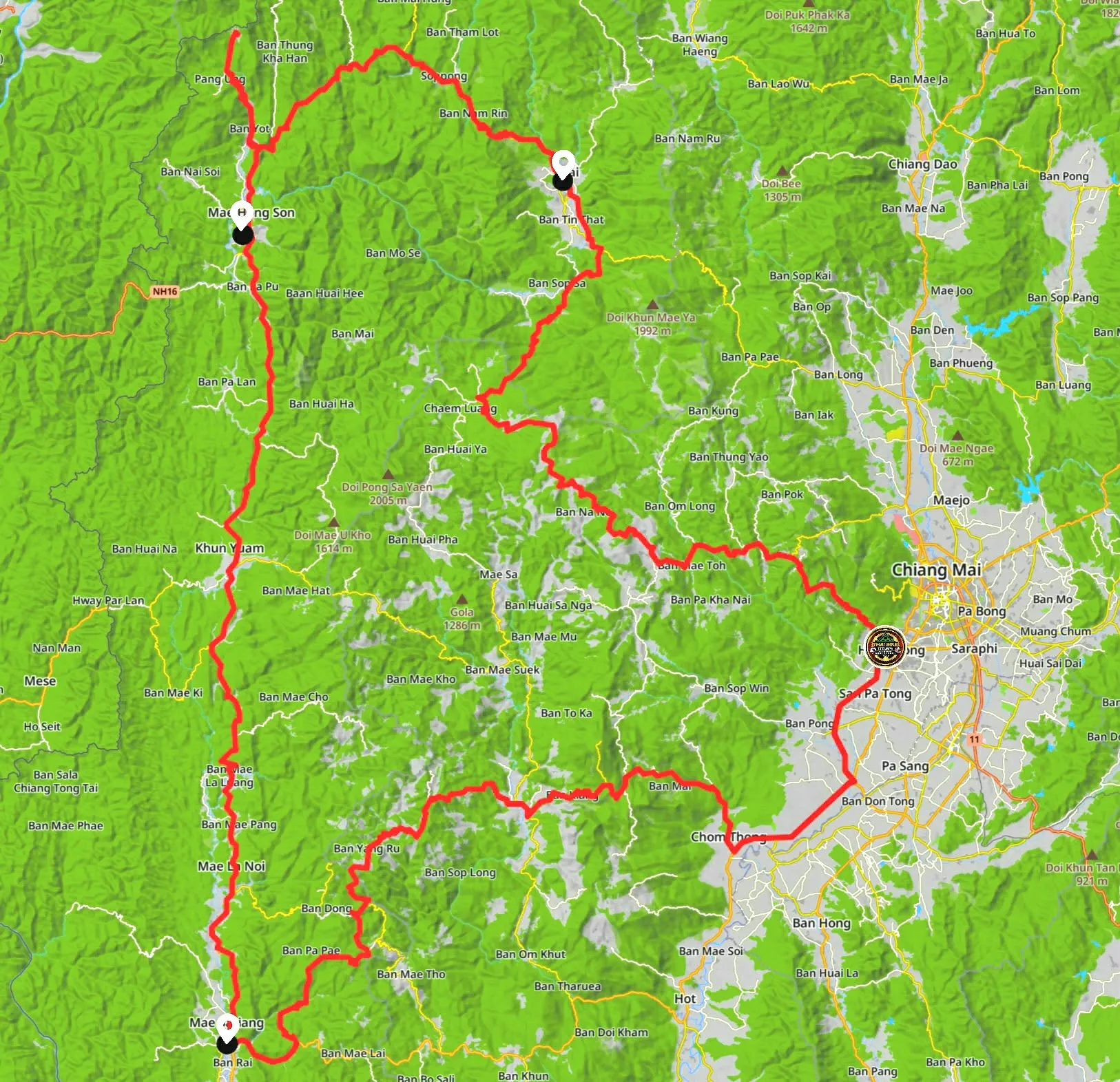 Scenic mountain sweepers and country roads descending back toward Chiang Mai.